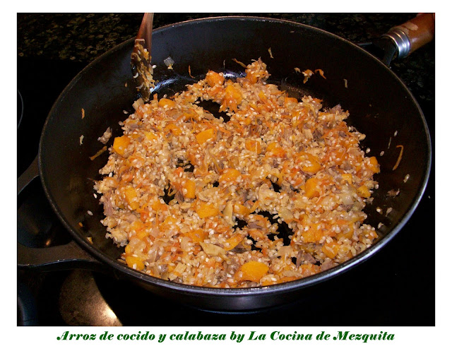 Hay infinitas posibilidades para esa carne que sobra; ropa vieja, croquetas, empanadillas, etc. pero a mi se me ocurrió este arroz, que además cumplía todos los requisitos para ser un plato de dieta… con lo que me gusta el arroz y la calabaza me puse las botas, quedó buenísimo!!