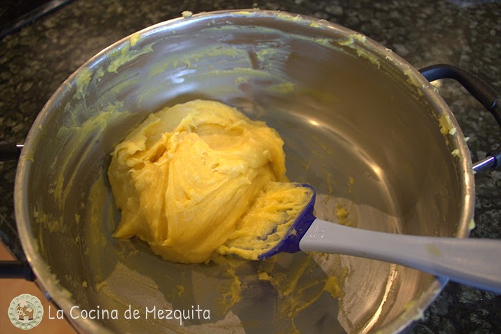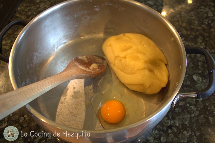 Una vez fría la masa de los buñuelos vamos añadiendo los huevos.
