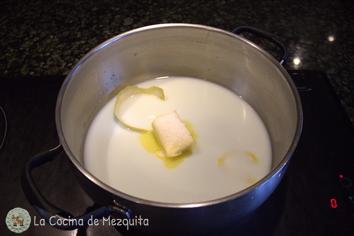 Para hacer la masa de los buñuelos pondremos en un cazo el agua, la leche, la mantequilla, el azúcar, la sal y la cáscara de limón.