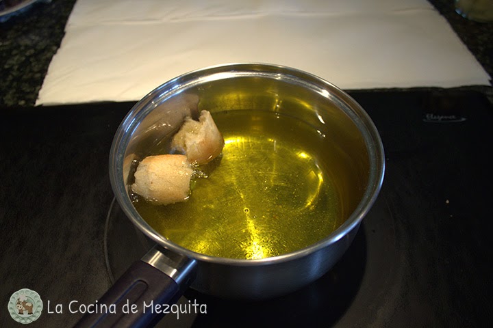Cogemos un cazo y le ponemos abundante aceite de oliva suave (sí, podéis freír con aceite de girasol). Yo siempre que voy a freír algo con aceite de oliva uso un truco que me enseñó mi madre para quitarle ese sabor tan fuerte característico de él y que funciona: poner dos trozos de pan en el aceite. Nos sirve para dos cosas: consigue que la fritura sea mucho más suave a nivel sabor y os ayuda a saber cuando el aceite está caliente (cuando el pan empiece a dorarse).