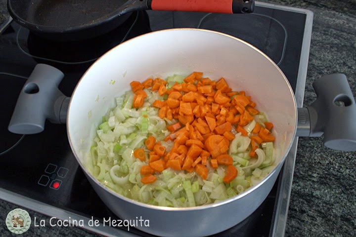 Pelamos y cortamos las zanahorias en trocitos y después de unos minutos las añadimos a la tartera.