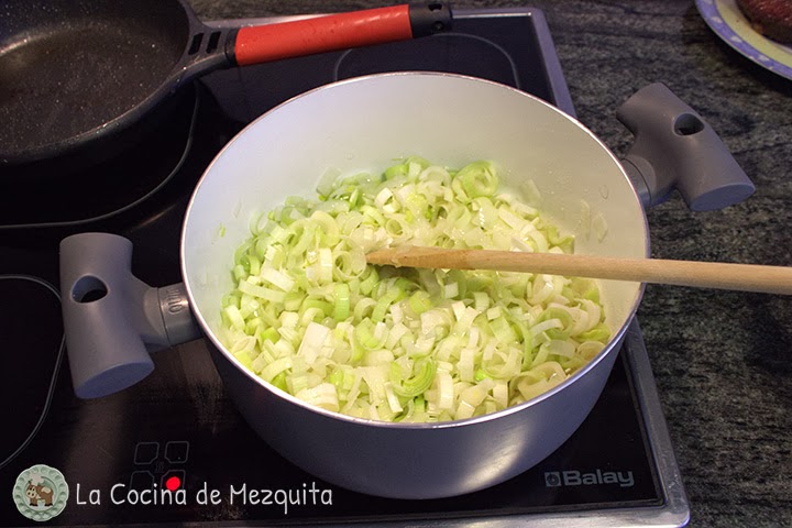 Lavamos y cortamos el puerro en trocitos igual que hemos hecho con la cebolla, y cuando veamos que ésta empieza a ponerse transparente añadimos el puerro.
