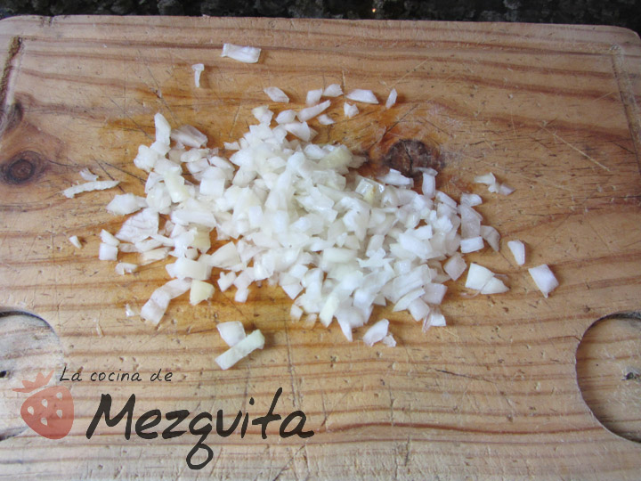 Pelamos y picamos la cebolla en trocitos muy pequeños. Añadimos a la crema.