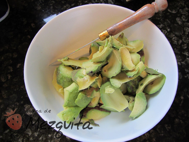 Lo primero será pelar y trocear en un bol los aguacates. Añadimos el zumo de limón.
