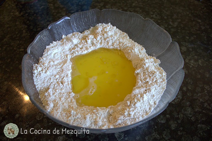 En un cuanco ponemos las dos harinas y la sal. Hacemos un hueco en el medio y añadimos los líquidos.