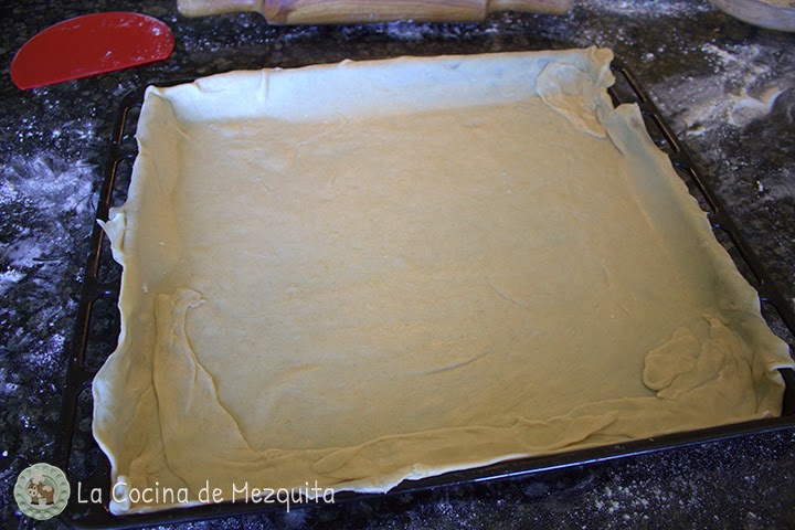 Untamos la fuente del horno con aceite de oliva suave. Estiramos la masa más grande con ayuda de un rodillo y harina y la ponemos sobre la fuente del horno (ya veis que yo tuve percances y parcheé la masa… sin problemas, estaba deliciosa igual).