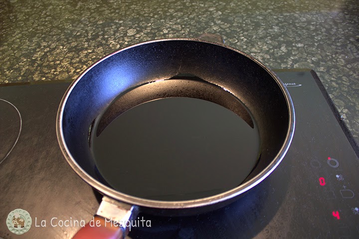 Pelamos las cebollas y las cortamos en cuadraditos tipo brunoise. En una sartén amplia cubrimos el fondo con aceite de oliva suave. Lo ponemos a fuego medio (6 de 9).