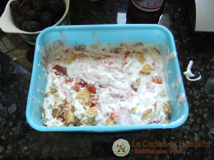 Pasamos el helado al recipiente donde lo vamos a guardar en el congelador. Troceamos las 12 galletas y se las echamos. Añadimos también las dos cucharadas soperas bien colmadas de mermelada de fresa.
