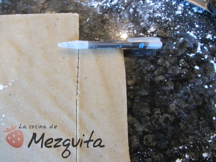 Ahora espolvoreamos la superficie de trabajo con azúcar glas (recordad, preferiblemente una superficie de trabajo donde podais sentaros con calma) y con ayuda de un rodillo estiramos la masa.