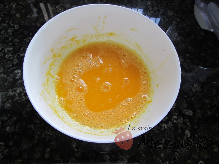 Vamos con el rellenos. Ponemos los ingredientes en un bol y batimos ligeramente (Cova no ponía esto de batirlos antes, pero a mi como me pareció que la receta no me estaba llevando casi tiempo le metí un paso extra).