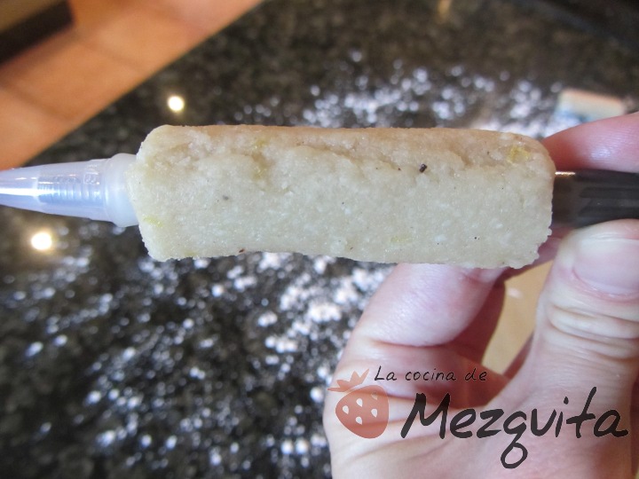 Cuando ya esté fría metemos en una manga pastelera (espero que la vuestra esté mejor educada que la mía) o bolsita de plástico (valen las de los congelados) a la que le cortaréis la punta y procedéis a rellenar los huesitos.
