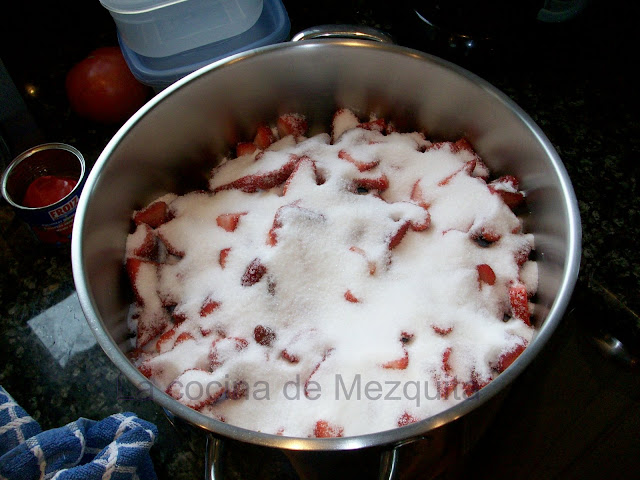 Poner las fresas en la olla donde vayamos a hacer la mermelada alternando capa de fresas con capa de azúcar.