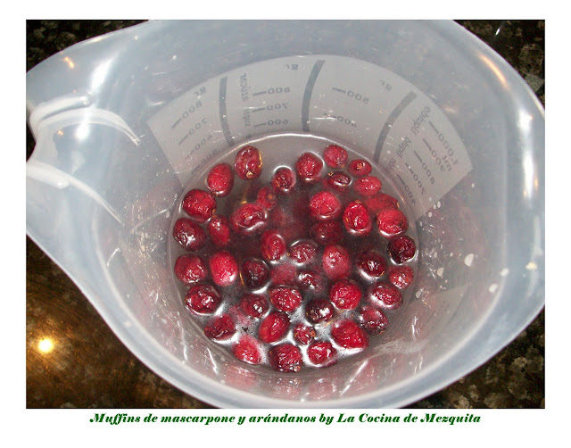 Lo primero que hice fue poner los arándanos a hidratar con agua el día anterior, Espe los echó secos, pero yo preferí que estuviesen más jugositos. Los dejamos en agua toda la noche.Cuando vayamos a hacer los muffins encendemos el horno a 180º.