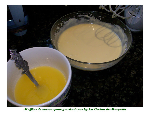 Los huevos deben de quedar espumosos.En otro bol ponemos el azúcar y el queso mascarpone y batimos hasta que la mezcla esté homogénea.