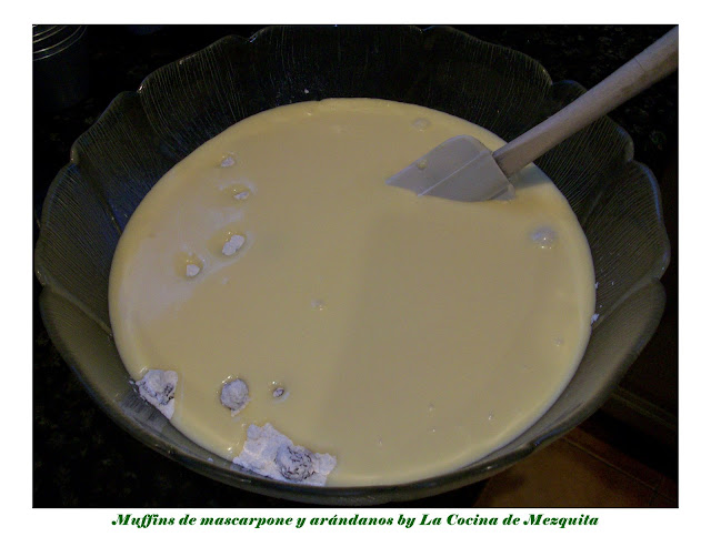 En otro bol grande ponemos la harina con el sobre de gasificante y añadimos los arándanos… Mezclamos con la cuchara.