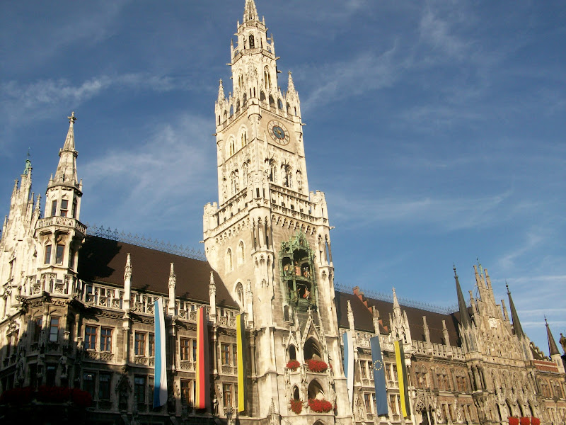 El ayuntamiento de Munich tiene un precioso carillón que se pone en marcha a las 11 de la mañana (en verano creo que tiene más horarios pero a las 11 lo pillais fijo). El carillón se compone de dos niveles: en la parte superior se representa un torneo que tiene lugar con motivo de la boda entre el duque Guillermo V de Wittelsbach con Renata de Lorena, mientras en la parte inferior se representa un baile típico de Munich con una historia muy peculiar: durante la epidemia de peste que asoló Alemania a principios del siglo XIV falleció un tercio de la población de Munich…. la gente estaba tan asustada que se negaban a salir de casa. La economía del lugar estaba por los suelos, así que un grupo de toneleros decidieron hacer un baile en la plaza del pueblo para festejar que la peste remitía y animar a las gentes a salir de sus casas y volver a sus vidas normales. Lo consiguieron claro (a saber que había en esos toneles) y de ahí su inmortalización en este precioso carillón que cuenta con 43 campanas y es capaz de tocar 4 melodías (bueno a mi juicio ligeramente desafinadas…. con perdón).