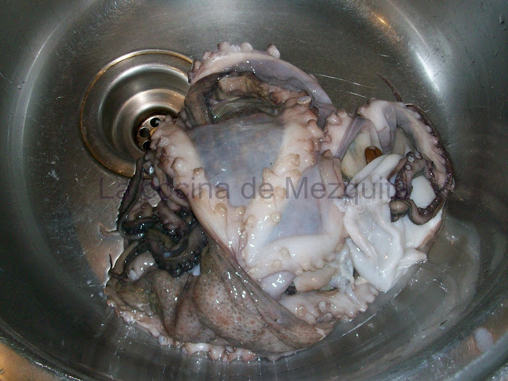 Evidentemente, después de tanto meneo hay que lavar el pulpo con abundante agua, para queitarle todas las impurezas que se le van pegando.