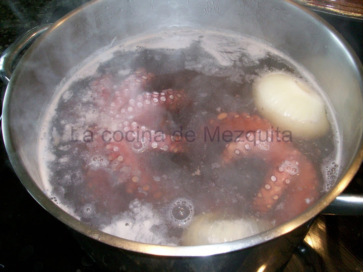 Por cierto, según mi madre, el pulpo se escalda un par de veces antes de echarlo a cocer para que no se le salte la piel, con lo que no haría falta el reposo posterior… yo nunca lo hago y descontando esos pulpos negros franceses o marroqíes que se encorrean y no hay Dios que los cueza, nunca se me saltó la piel siguiendo los consejos de mi madre…