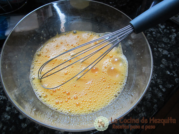 En un bol batimos los 4 huevos con un poco de sal y pimienta negra recién molida (no os dejéis engañar por el número de yemas de la foto, los huevos eran de casa y uno venía con dos yemas).