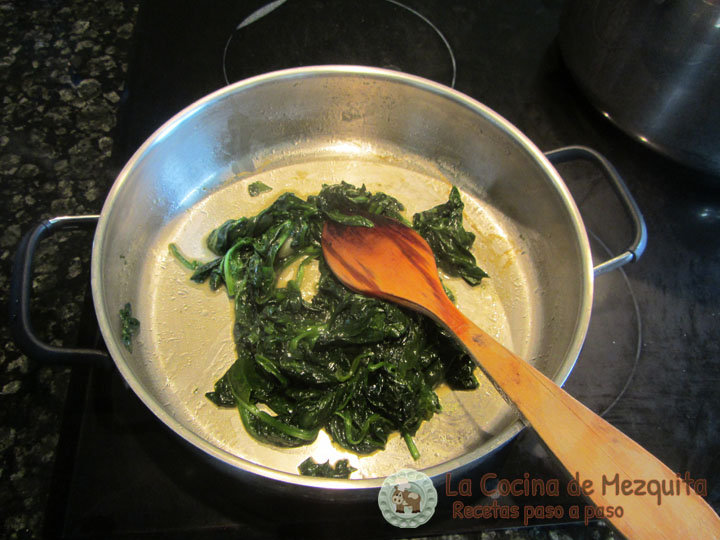 Cuando el ajo empiece a dorarse echamos las espinacas y bajamos un poco el fuego (6 de 9). Dejamos que las espinacas se vayan rehogando. Primero soltarán el líquido y luego ese propio jugo se evaporará.