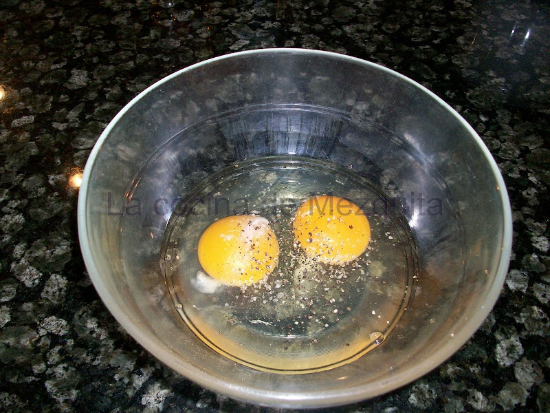 En un bol ponemos los dos huevos con un poco de sal y pimienta y batimos bien.