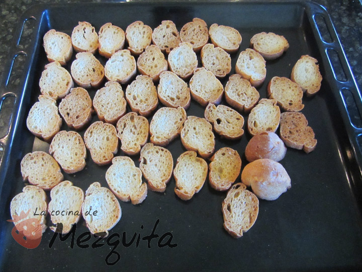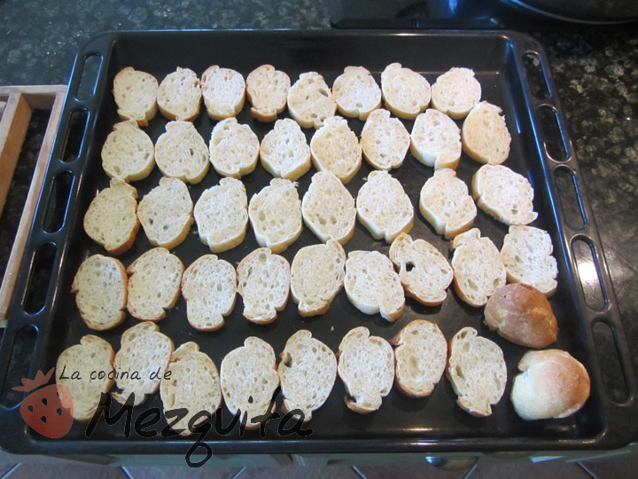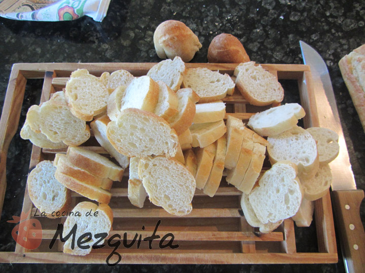 Muy sencillo: cogéis el pan que os haya sobrado y lo cortáis en rebanadas finas. No tiréis los curruscos, luego os cuento.