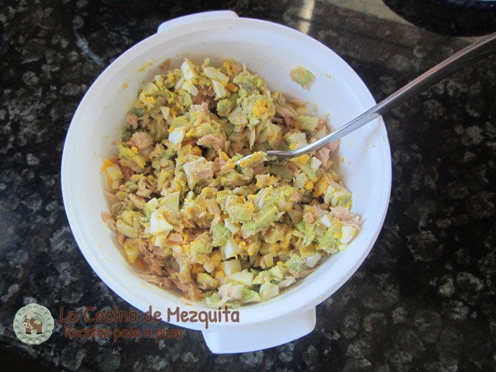 Pelamos y cortamos los huevos en trocitos pequeños, como para salpicón y añadimos al aguacate.